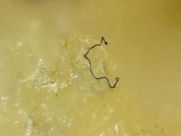 La deuxième chose qui a surpris les chercheurs au niveau de la surface du nuggets est l’apparition sous microscope de divers structures – d’étranges fibres ou encore des espèces de « brin de cheveux noirs » apparaissent.